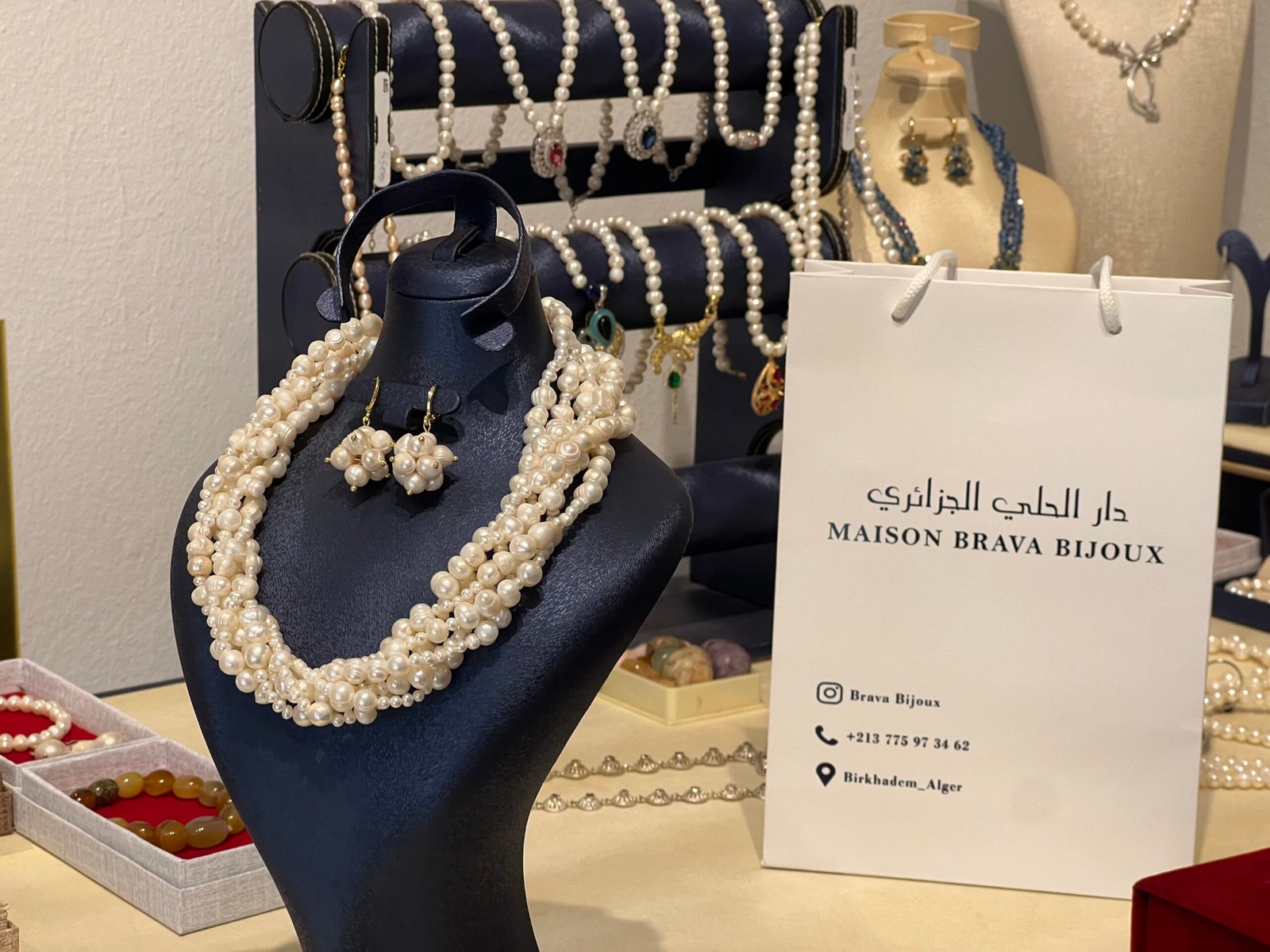 Grand collier de cérémonie six fils en perles de Djouher véritable avec boucles assorties Maison Brava Bijoux